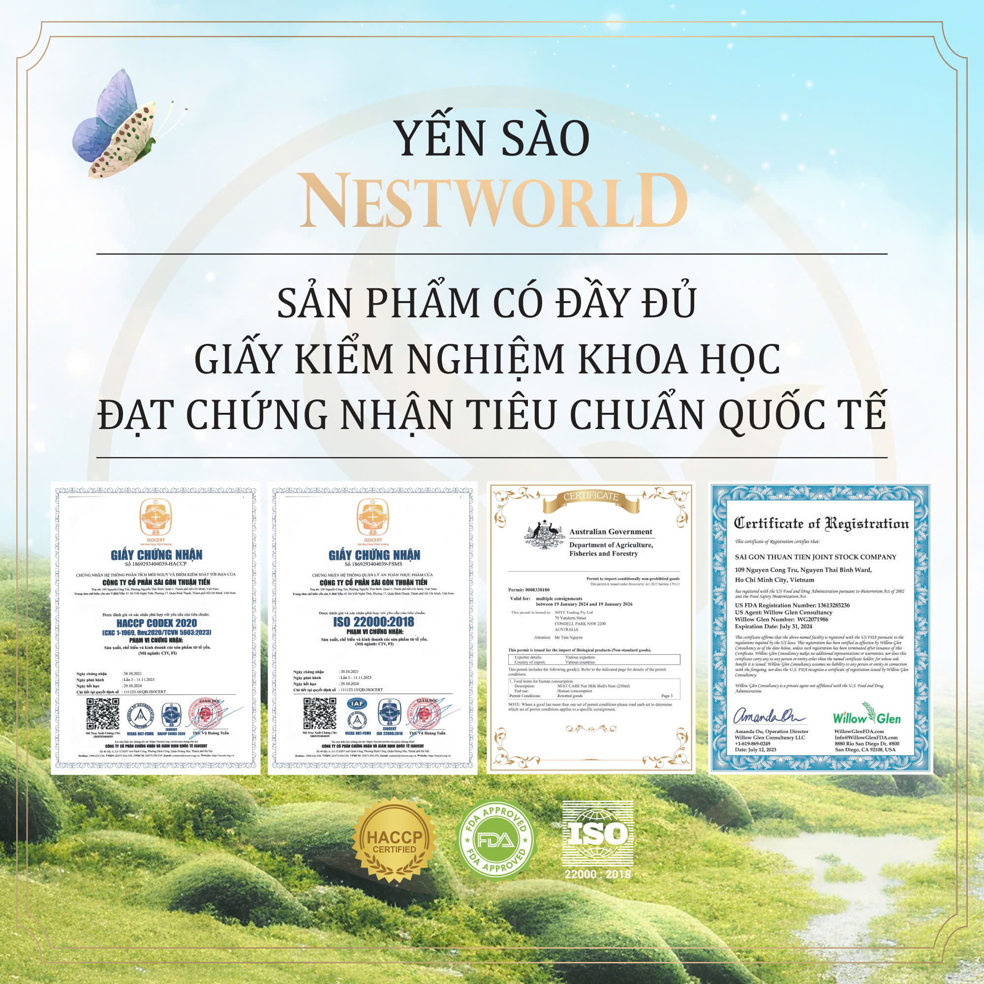 Sản phẩm của Nestworld không chỉ đạt chứng nhận An toàn vệ sinh thực phẩm do Sở An Toàn Thực Phẩm TP.HCM cấp mà còn tuân thủ hệ thống quản lý an toàn thực phẩm theo tiêu chuẩn quốc tế ISO 22000:2018 và HACCP.