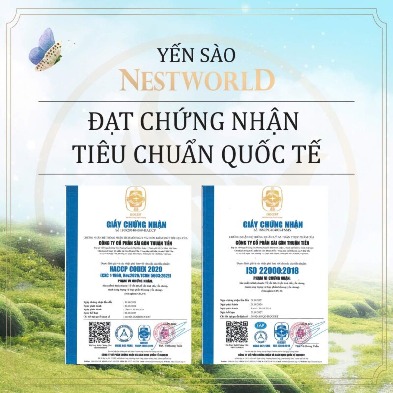 Sản phẩm của Nestworld không chỉ đạt chứng nhận An toàn vệ sinh thực phẩm do Sở An toàn thực phẩm TP.HCM cấp, mà còn tuân thủ hệ thống quản lý an toàn thực phẩm theo tiêu chuẩn quốc tế ISO 22000:2018 và HACCP.