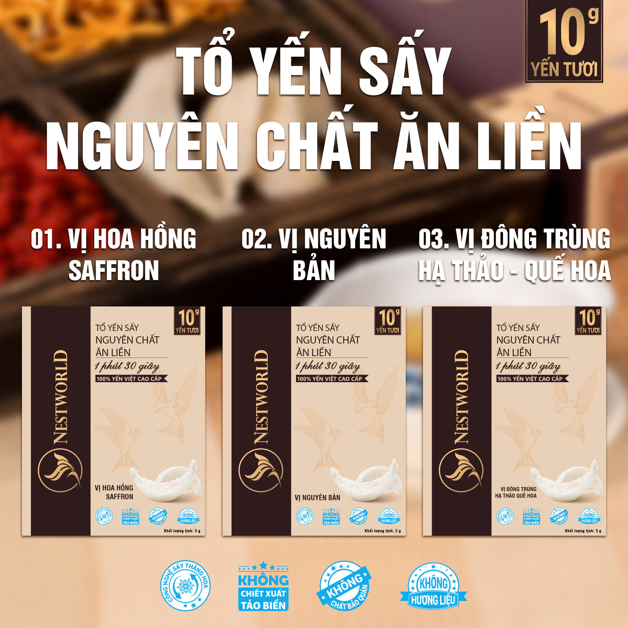 Tổ Yến Sấy Nguyên Chất Ăn Liền Nestworld có 3 vị: vị nguyên bản, vị hoa hồng saffron, vị đông trùng hạ thảo – quế hoa