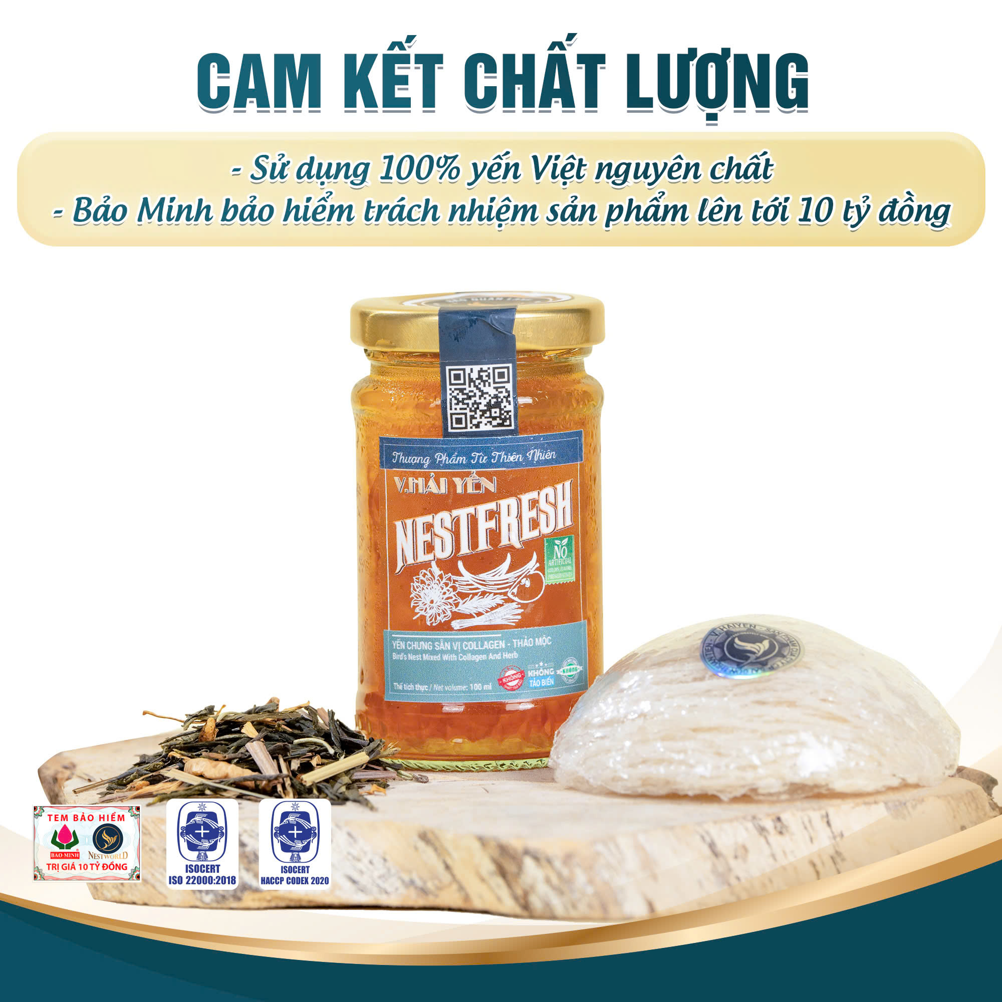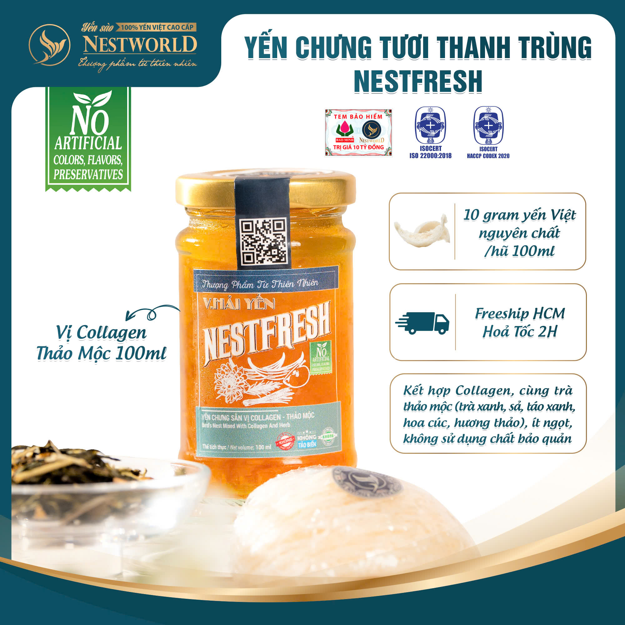 NESTFRESH vị Collagen – Thảo mộc là sản phẩm yến tươi chưng sẵn giữ lạnh, được kết hợp giữa sợi yến Việt nguyên chất, trà thảo mộc, collagen…